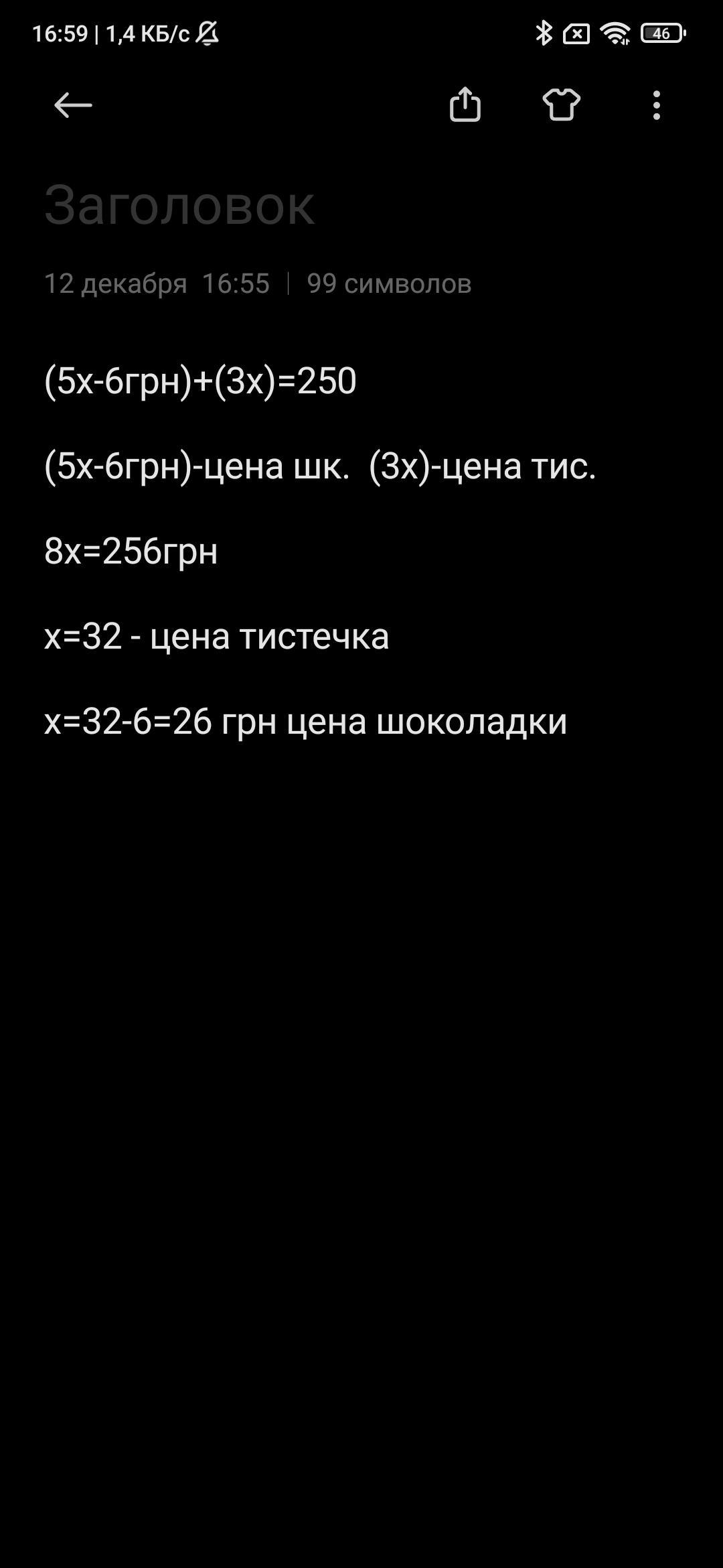 За 5 шоколадок та 3 тістечка заплатили 250 грн. Скільки коштує шоколадка, якщо вона на 6 грн дешевша за тiстечко?