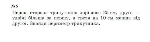 1 сторона 25 см 2 сторона 50 см 3 сторона 40 см рішення: 25*2=50 50-10=40 п=25+50+40=115