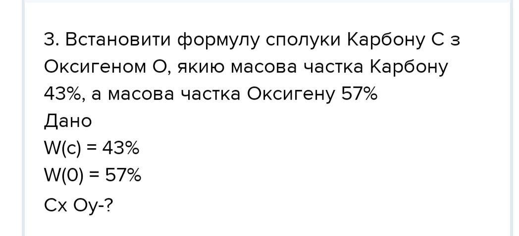 Срочно!!!!!!Встановити формулу сполуки Карбону С з Оксигеном О, якию масова частка Карбону 43%, а масова частка Оксигену 57% Дано W(c) = 43% W(0) = 57% Cx Oy-?