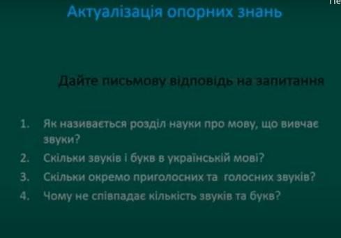 Актуалізація опорних знань Дайте письмову відповідь на запитання 1. Як називається роздiл науки про мову, що вивчае звуки? 2. Скільки звуків і букв в українській мові? 3. Скільки окремо приголосних та голосних звуків? 4. Чому не співпадае кiлькiсть звукiв та букв? Перегл