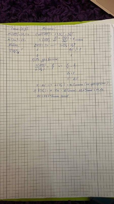 1) 65 г цинку ввели в реакцію із такою кількістю хлоридної кислоти, яка містить 36.5 г хлороводню. Обчисліть об’єм водню (н.у.), який мав виділитися. Запишіть відповідь у літрах.