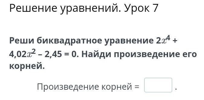 Реши биквадратное уравнение 2х⁴ + 4,02x² – 2,45 = 0. Найди произведение его корней.