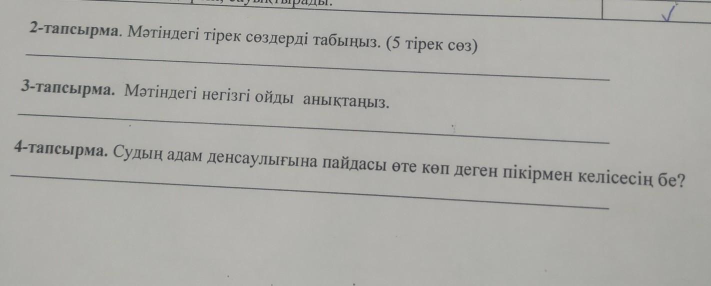 2-тапсырма. Мәтiндегi тiрек сөздерді табыңыз. (5 тірек сөз) 3-тапсырма. Мәтіндегі негізгі ойды анықтаңыз. 4-тапсырма. Судың адам денсаулығына пайдасы өте көп деген пiкiрмен келісесің бе?