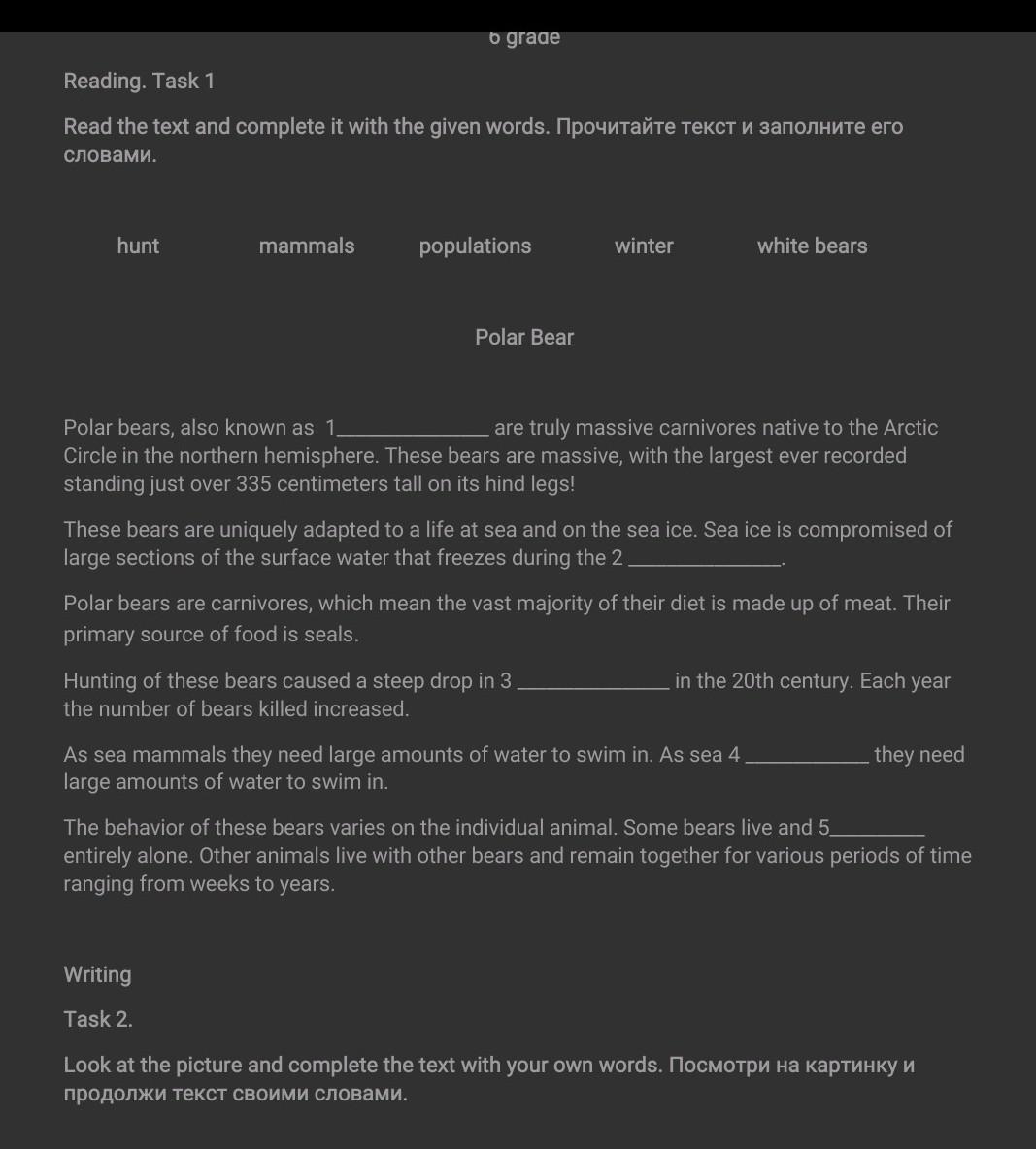 Read the text and complete it with the given words. Прочитайте текст и заполните его словами. hunt mammals populations Polar Bear winter Polar bears, also known as 1 are truly massive carnivores native to the Arctic Circle in the northern hemisphere. These bears are massive, with the largest ever recorded standing just over 335 centimeters tall on its hind legs! These bears are uniquely adapted to a life at sea and on the sea ice. Sea ice is compromised of large sections of the surface water that freezes during the 2 Hunting of these bears caused a steep drop in 3. the number of bears killed increased. Writing Task 2. white bears Polar bears are carnivores, which mean the vast majority of their diet is made up of meat. Their primary source of food is seals. As sea mammals they need large amounts of water to swim in. As sea 4 large amounts of water to swim in. in the 20th century. Each year they need The behavior of these bears varies on the individual animal. Some bears live and 5_ entirely alone. Other animals live with other bears and remain together for various periods of time ranging from weeks to years.