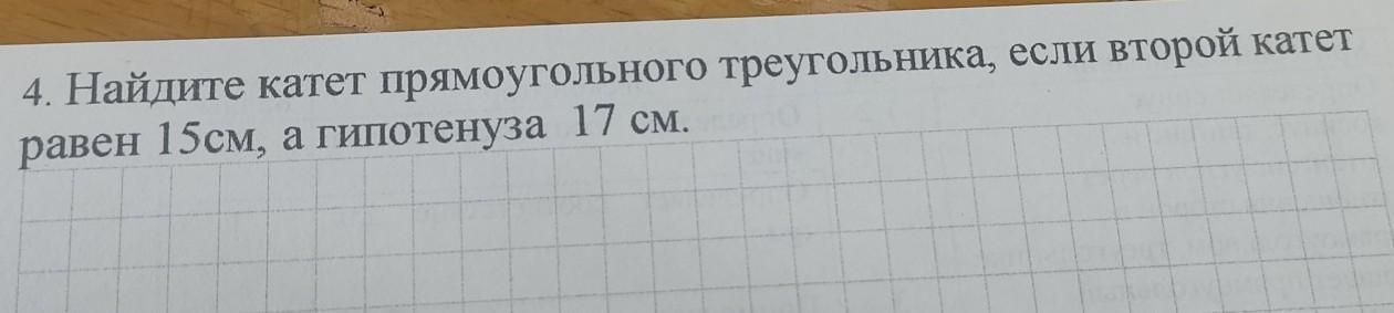 4. Найдите катет прямоугольного треугольника, если второй катет равен 15см, а гипотенуза 17 см.
