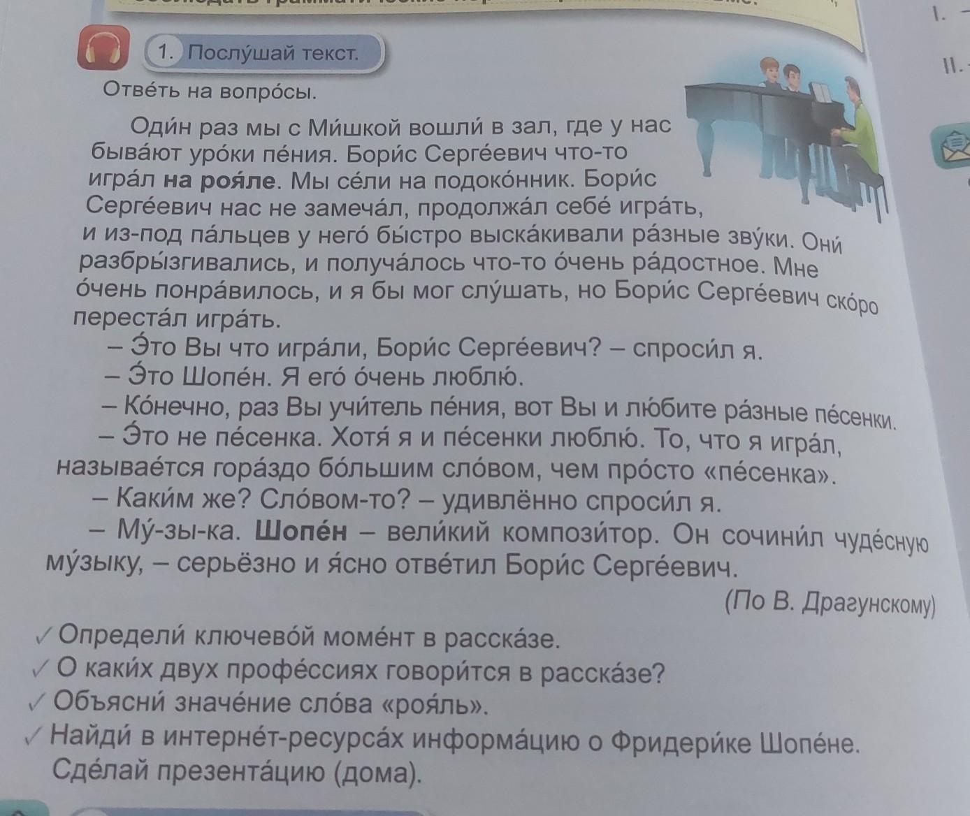III 1. Послушай текст. Ответь на вопросы. Один раз мы с Мишкой вошли в зал, где у нас бывают уроки пéния. Борис Сергéевич что-то играл на рояле. Мы сéли на подоконник. Борис Сергéевич нас не замечал, продолжал себé играть, и из-под па́льцев у него быстро выскакивали разные звуки. Они разбрызгивались, и получалось что-то очень радостное. Мне óчень понравилось, и я бы мог слушать, но Борис Сергеевич скоро перестал играть. — Это Вы что играли, Борис Сергéевич? — спросил я. - Это Шопен. Я егó óчень люблю. - Конечно, раз Вы учитель пения, вот Вы и любите разные песенки. — Это не песенка. Хотя я и песенки люблю. То, что я играл, называется гораздо большим словом, чем просто «песенка». - Каким же? Словом-то? - удивлённо спросил я. - Мў-зы-ка. Шопен - великий композитор. Он сочинил чудесную - (По В. Драгунскому) музыку, - серьёзно и ясно ответил Борис Сергеевич. Определи ключевой момент в рассказе. v О каких двух профессиях говорится в рассказе? Объясни значение слова «рояль». Найди в интернет-ресурсах информацию о Фридерике Шопене. Сделай презентацию (дома). CONTÁR