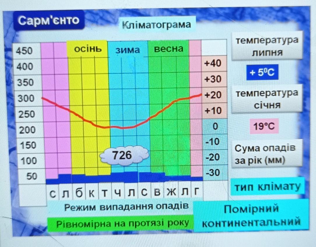 Як видно з кліматограми, температура січня +19°, липня +5°, середньорічна кількість опадів 726 мм.