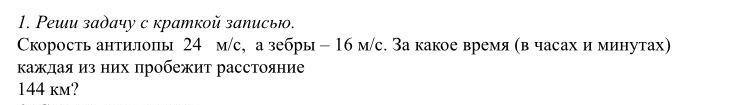 1. Реши задачу с краткой записью. Скорость антилопы 24 м/с, а зебры - 16 м/с. За какое время (в часах и минутах) каждая из них пробежит расстояние 144 км?