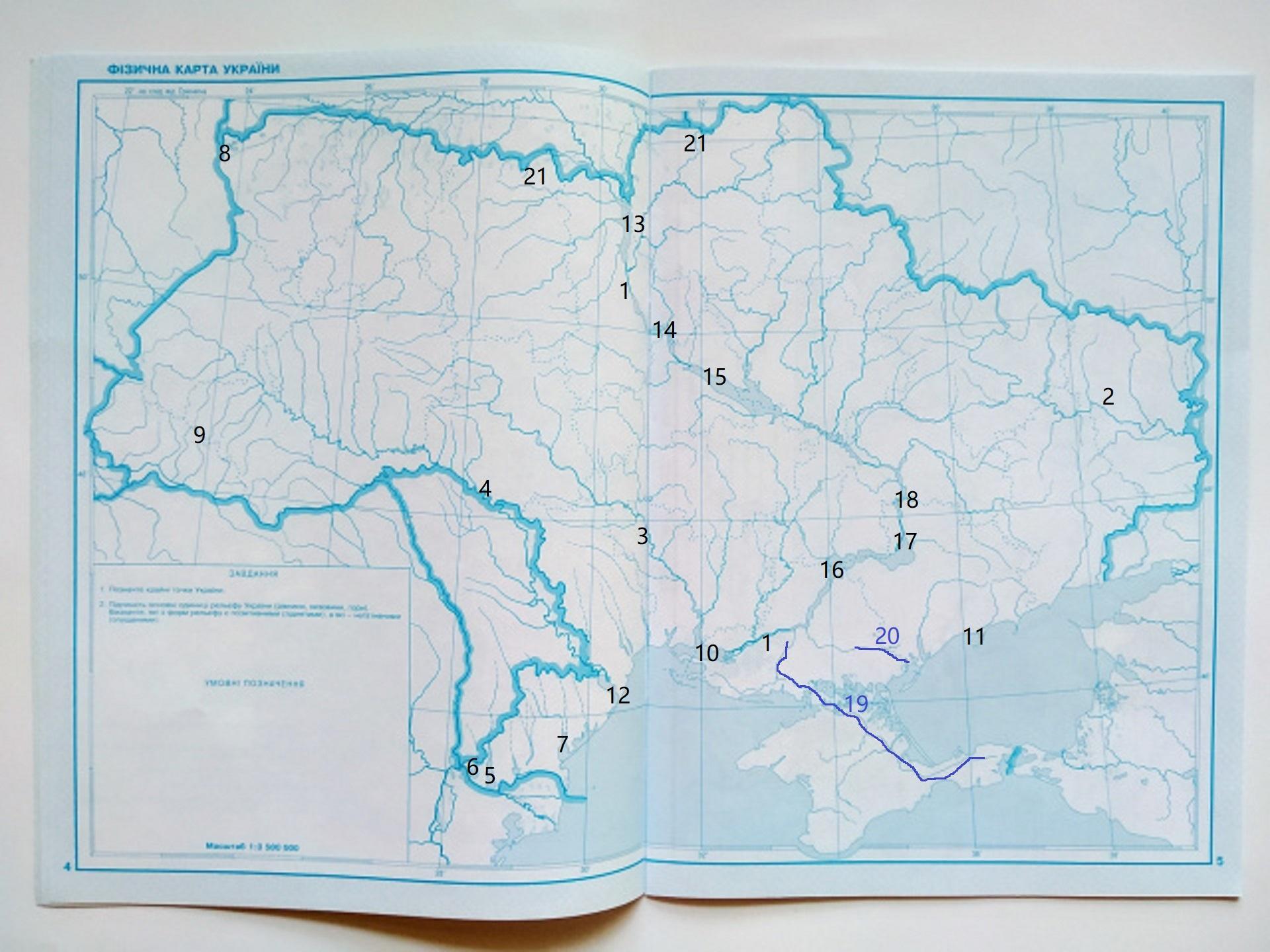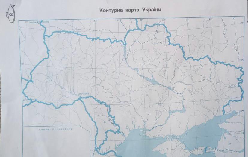 - Позначення на контурній карті найбільших річок, озер, водосховищ, каналів, боліт України.