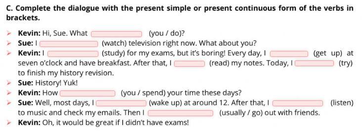 Kevin: I am studying for my exams, but it's boring! Every day, I get up at seven o'clock and have breakfast. After that, I read my notes. Today, I am trying to finish my history revision.