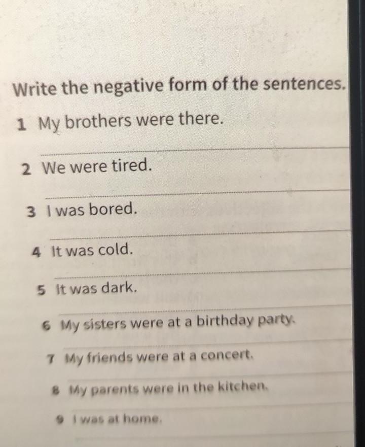 Write the negative form of the sentences. 1 My brothers were there. 2. We were tired. 3 I was bored. 4 It was cold. 5 It was dark. 6 My sisters were at a birthday party. 7 My friends were at a concert. 8 My parents were in the kitchen. 9 I was at home.