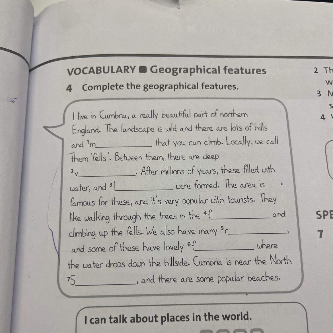 I live in Cumbria, a really beautiful part of northern England. The landscape is wild and there are lots of hills and 1) mountains that you can climb. Locally, we call them 'fells'. Between them, there are deep 2) valleys. After millions of years, these filled with water, and 3) lakes were formed. The area is famous for these, and it's very popular with tourists. They like walking through the trees in the 4) forest and climbing up the fells. We also have many 5) rivers, and some of these have lovely 6) falls where the water drops down the hillside. Cumbria is near the North 7) Sea, and there are some popular beaches.