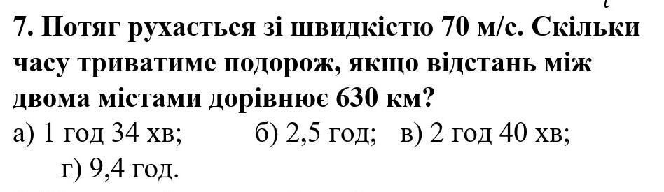 630 км переводимо у метри, отримуємо 630 000 метрів. За формулою v= знаходимо t=s/v. отже 630 000/70 = 9000 секунд. Це 150 хв або 2.5 години