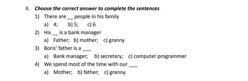 Срочно!!! Срочно!!! II. Choose the correct answer to complete the sentences 1) There are people in his family a) 4; b) 5; c) 6 2) His is a bank manager a) Father; b) mother; c) granny 3) Boris' father is a a) Bank manager; b) secretary; c) computer programmer 4) We spend most of the time with our a) Mother; b) father; c) granny.