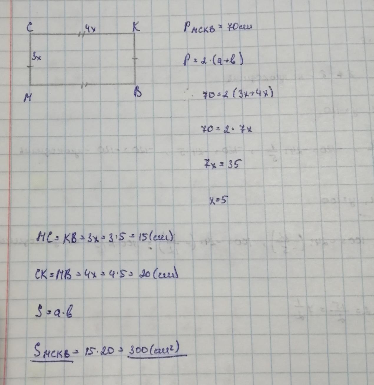 Знайти площу прямокутника МСКВ, якщо МС СК = 3 : 4, периметр прямокутника дорівнює 70 см.