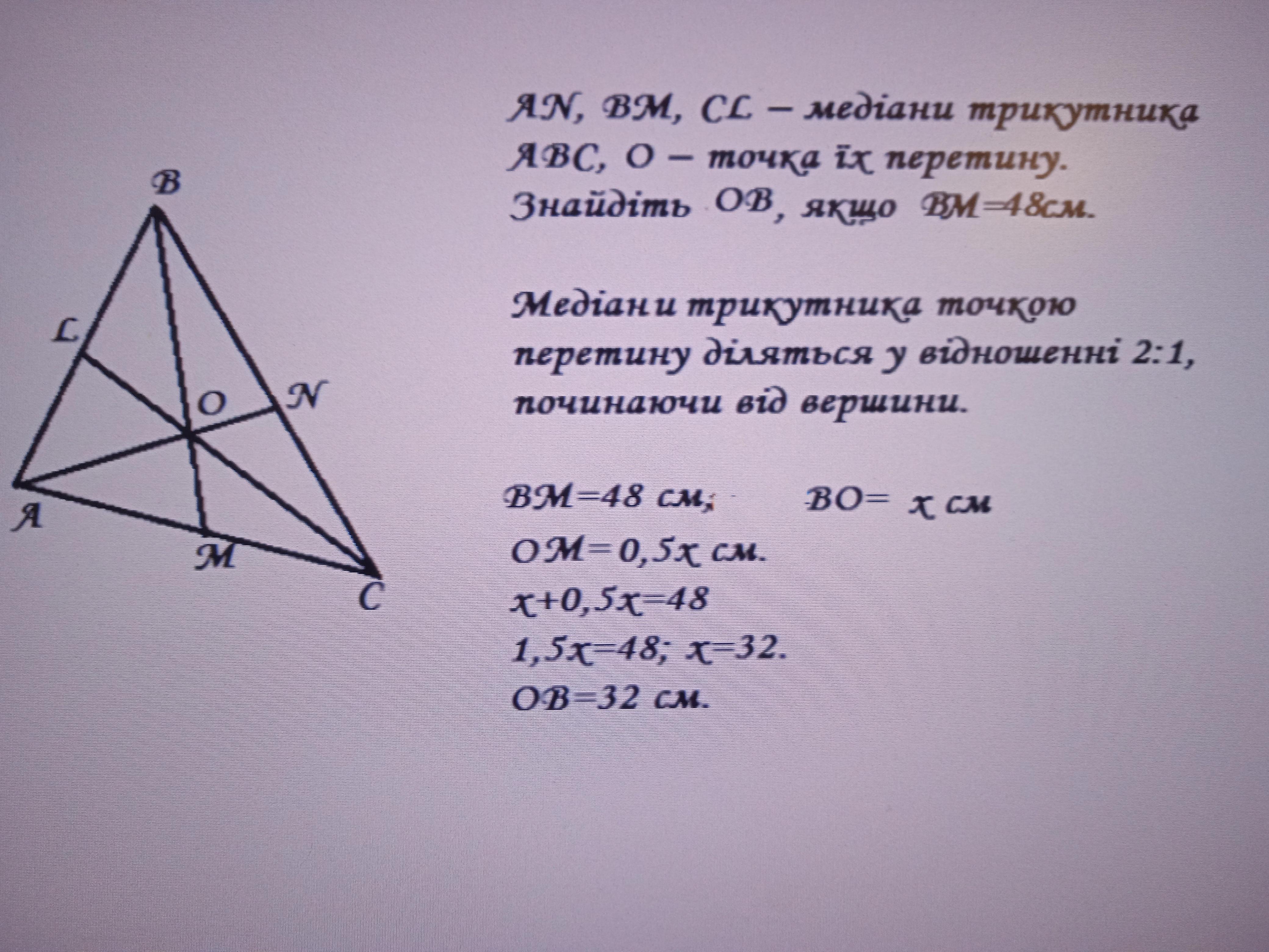 АN, BN, CL – медіани трикутника АВС, О – точка їх перетину. Знайдіть ОВ, якщо ВМ=48 см.