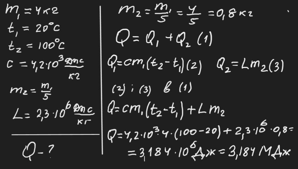 воду масою 4 кг , взятої 20c нагріли до кіпіння і п'яту. частину перетворили в пару. скільки теплоти потрібно затратити при цьому? (!!!напишіть не тільки відповідь, а і дії!!!)