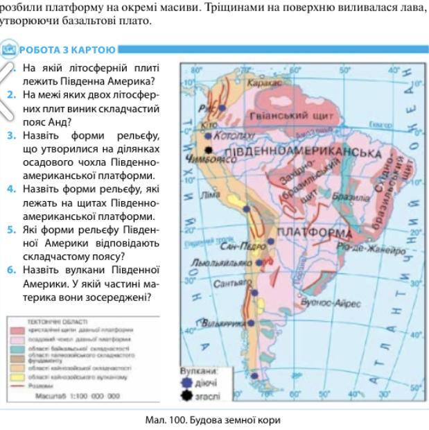 5 Із заходу до Південноамериканської платформи примикає складчастий пояс Анд. Він виник на межі двох літосферних плит, коли океанічна плита, занурюючись у мантію, ніби „пірнула”, підсунулася під континентальну. При цьому край континентальної плити зім'явся у складки, утворивши гори Анди.