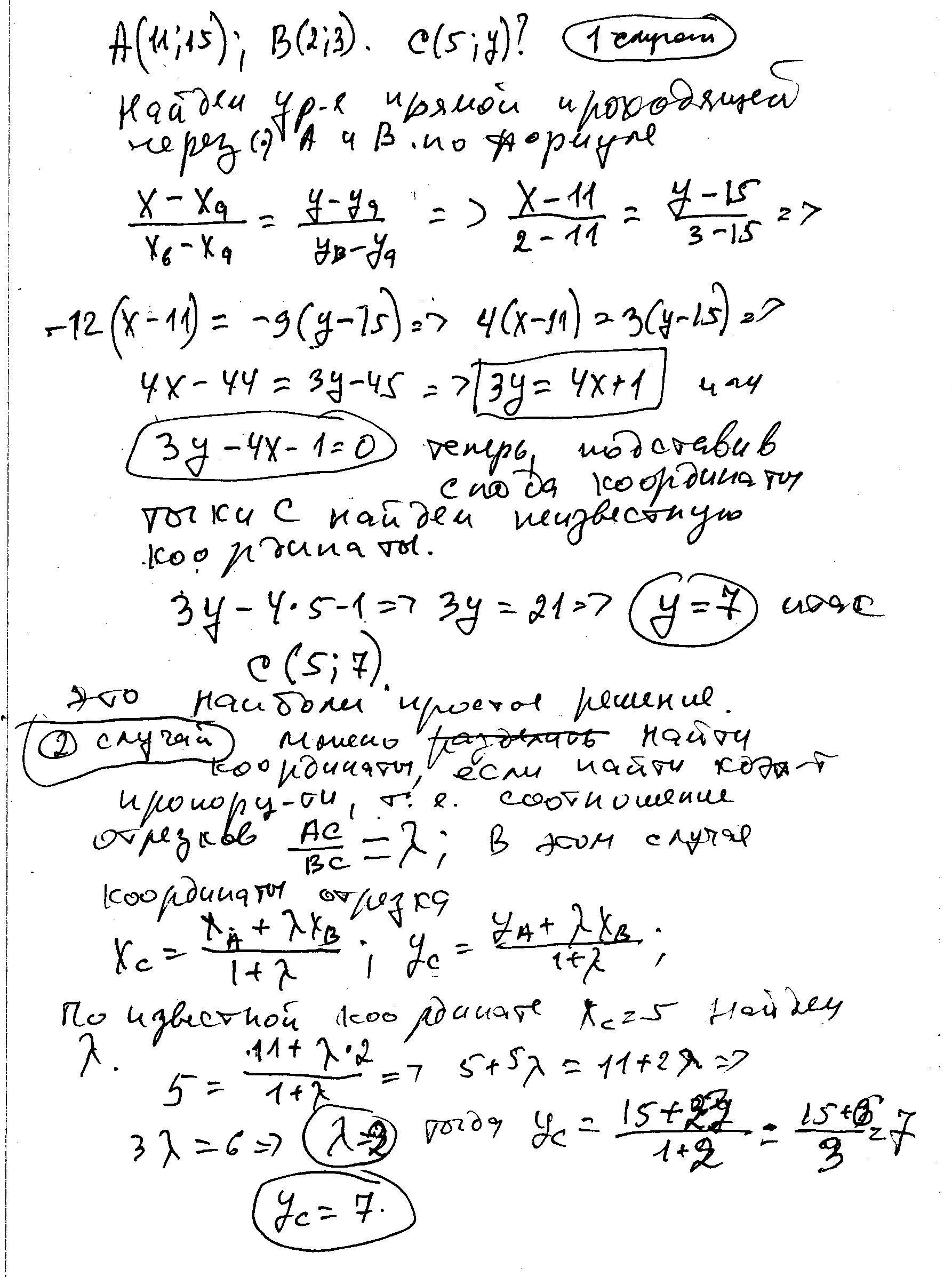 На прямой,проходящей через точки А(11;15) и В(2;3),найдтие ординату точки С,абцисса которой равна 5. Помогите пожалуйста решить