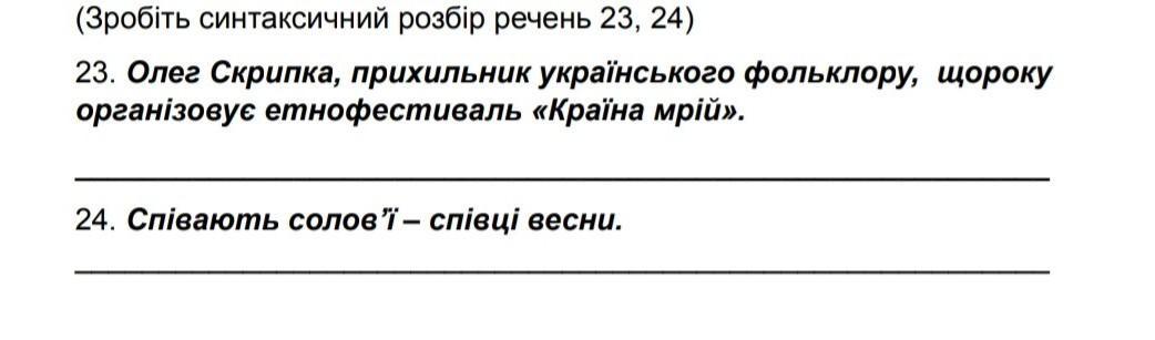 23. Олег Скрипка (іменник) прихильник(іменник) українського (додаток) фольклору (прислівник)