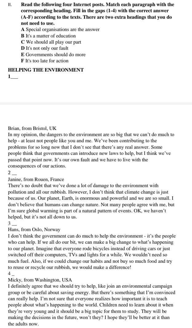 Прочтите следующие четыре поста в Интернете. Соедините каждый абзац с соответствующим заголовком. Заполните пропуски (1-4) правильным ответом (A-F) согласно текстам. Есть два дополнительных заголовка, которые вам не нужно использовать