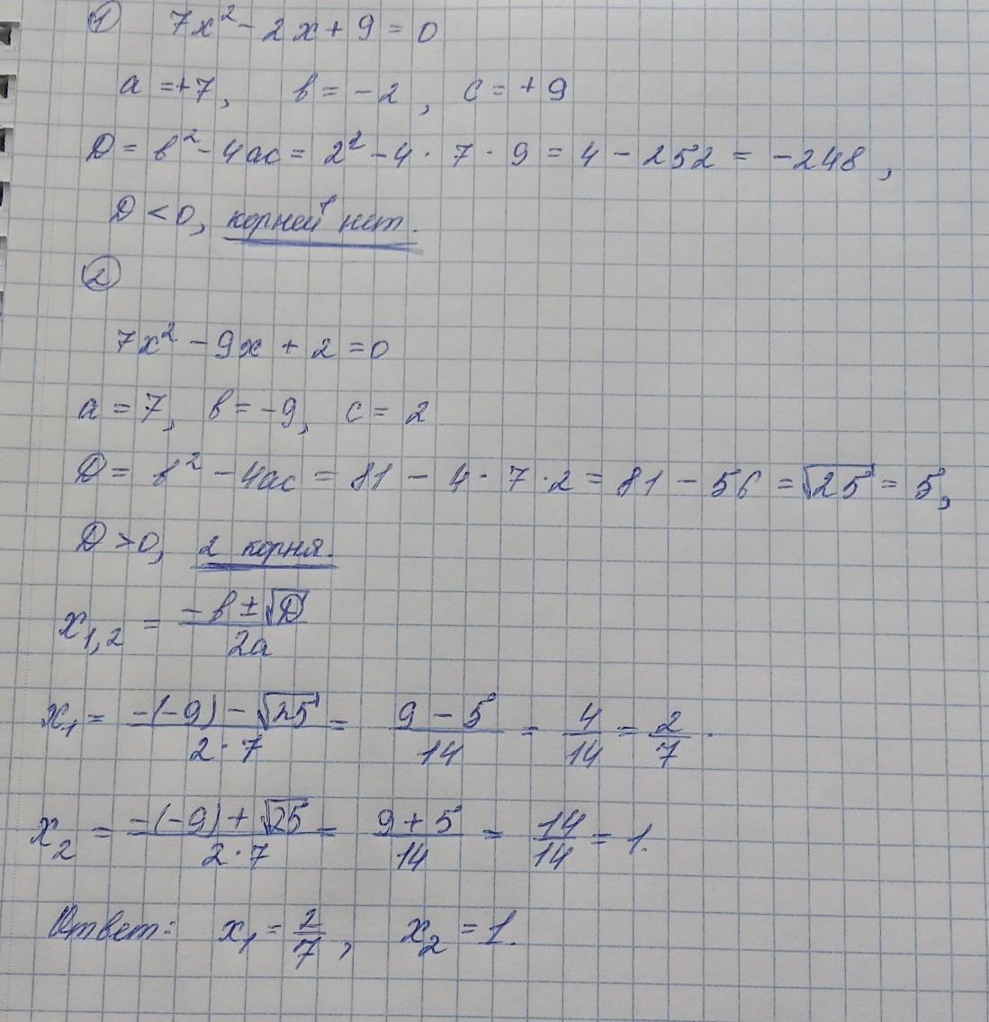 определите сколько корней имеет каждое уравнение и найдите корни если они существуют 1)7х²-2х+9=0 2)7х²-9х+2=0.