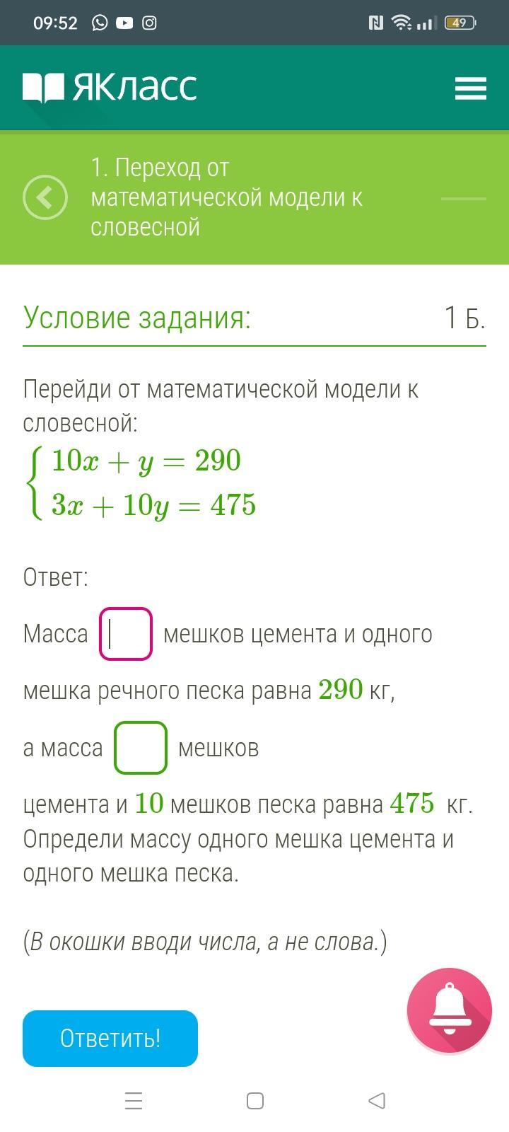 масса ? мешков цемента и одного мешка речного песка равна 290 кг а масса ? мешков цемента и 10 мешков песка равна 475кг . Определите массу одного мешека цемента и одного мешка песка