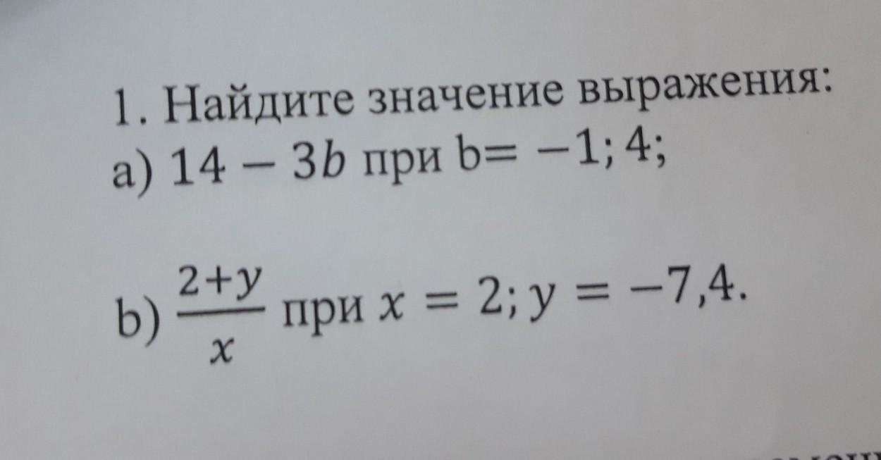 1. Найдите значение выражения: a) 14 - 3b при b= -1; 4; 2+у b) . X при x = 2; у = −7,4.