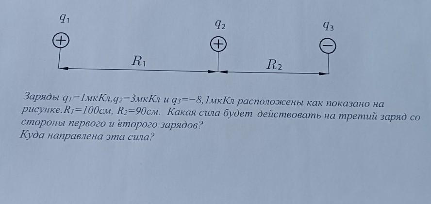 91 R₁ 92 (+ R₂ 93 Заряды qi=1мкКл,q2=3мкКл u q3=-8,1 мкКл расположены как показано на рисунке.R1=100см, R2=90см. Какая сила будет действовать на третий заряд со стороны первого и второго зарядов? Куда направлена эта сила?