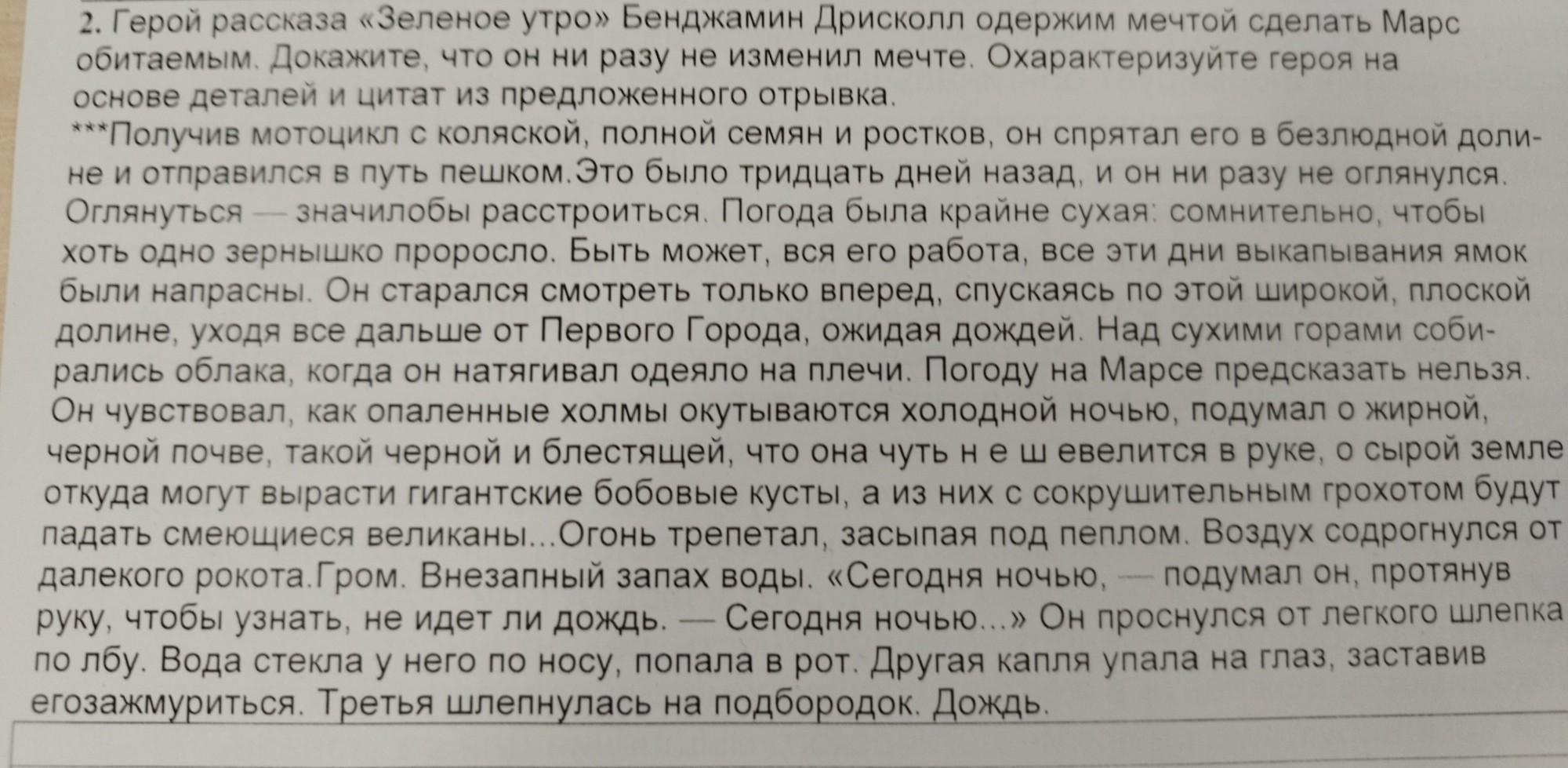 Главный герой рассказа «Зеленое утро» Р.Бредбери Бенджамин Дрисколл, прилетевший на Марс без определенной цели, но в одно мгновенье понявший, зачем он это сделал. Не смотря на то, что он был слаб, и люди его могли не понять, Бенджамин потратил целый месяц сажая там деревья. Тридцать дней он делал лунки, бросал туда семена. Ни разу не оглянувшись назад, веря в свою мечту Дрисколл делал свое дело. Финал был прекрасен – на Марсе за одну дождливую ночь выросли миллионы деревьев, появился воздух.