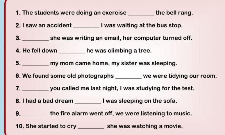 1. The students were doing an exercise 2. I saw an accident 3. 4. He fell down 5. 6. We found some old photographs 7. 8. I had a bad dream 9. 10. She started to cry the bell rang. I was waiting at the bus stop. she was writing an email, her computer turned off. he was climbing a tree. my mom came home, my sister was sleeping. we were tidying our room. you called me last night, I was studying for the test. I was sleeping on the sofa. the fire alarm went off, we were listening to music. she was watching a movie.