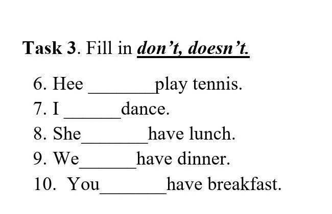 Task 3. Fill in don't, doesn't. 6. Hee play tennis. 7. I 8. She 9. We 10. You dance. have lunch. have dinner. have breakfast.