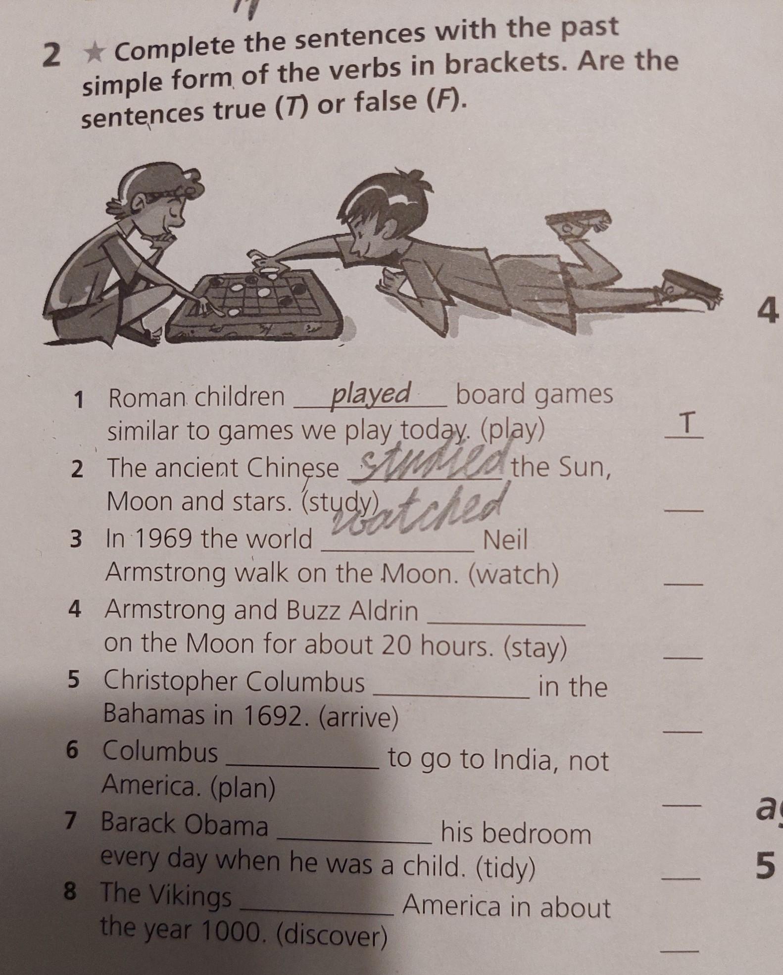 2 Complete the sentences with the past simple form of the verbs in brackets. Are the sentences true (7) or false (F). 1 Roman children played similar to games we play today. (play) 2 The ancient Chinese Moon and stars. (stydyched 3 In 1969 the world 5 Christopher Columbus Neil Armstrong walk on the Moon. (watch) Armstrong and Buzz Aldrin 4 on the Moon for about 20 hours. (stay) in the board games tied the Sun, Bahamas in 1692. (arrive) 6 Columbus the year 1000. (discover) to go to India, not America. (plan) 7 Barack Obama_______ every day when he was a child. (tidy) 8 The Vikings his bedroom America in about T 4