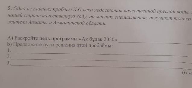 5. Одна из главных проблем XXI века недостаток качественной пресной воды. В нашей стране качественную воду, по мнению специалистов, получают только жители Алматы и Алматинской области. А) Раскройте цель программы «Ак бұлақ 2020» b) Предложите пути решения этой проблемы: