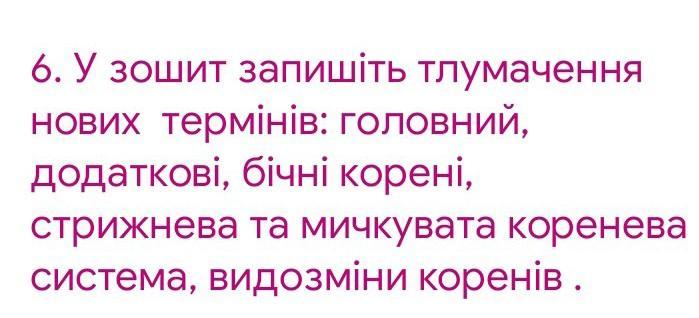 6. У зошит запишіть тлумачення нових термінів: головний, додаткові, бічні корені, стрижнева та мичкувата коренева СИСТЕМА, ВИДозмiни коренів.