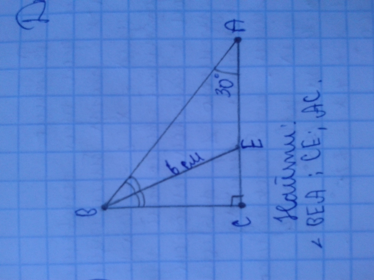 угол ВЕА равен 120 град.( в прямоугол. треугл. один угол 90 градус, значит остальные два будут острыми 180-90-30=60граду. угл АВЕ=ЕВС- биссектриса АВЕ равно 30 градус. рассмотрем треугл.ВЕА сумма углов в треугл. равно 180 град. 180-30-30= 120град.