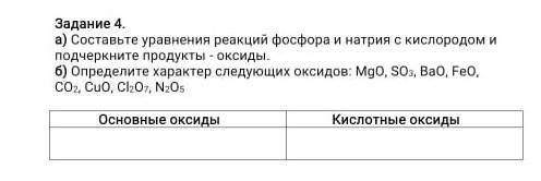 Задание 4. а) Составьте уравнения реакций фосфора и натрия с кислородом и подчеркните продукты - оксиды. б) Определите характер следующих оксидов: MgO, SO3, BaO, FeO, СО2, Сио, с 207, 20 Основные оксиды Кислотные оксиды. ПОЖАЛУЙСТА ПОМОГИТЕ У МЕНЯ СОР!