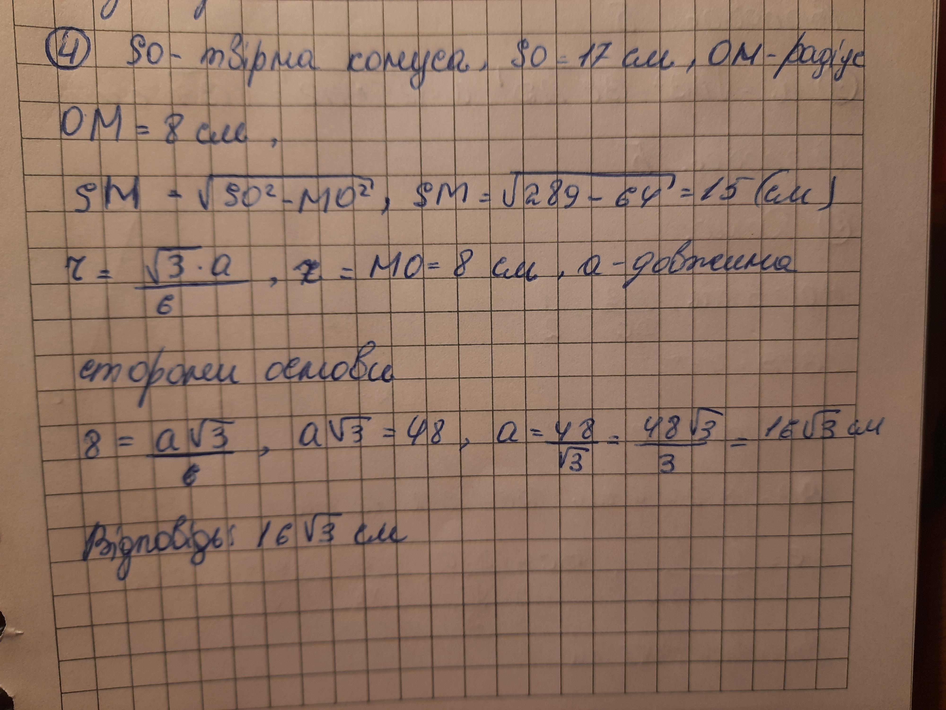 У правильну трикутну піраміду вписано конус. Знайдіть висоту та сторону основи піраміди, якщо твірна конуса дорівнює 17см, а радіус основи – 8 см.