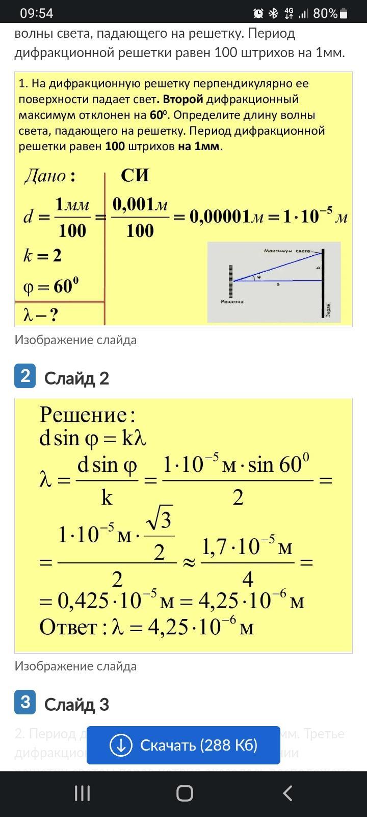 На дифракционную решетку перпендикулярно ее поверхности падает свет. Второй дифракционный максимум отклонен на 60º. Определите длину волны света, падающего на решетку. период дифракционной решетки равен 100 штрихов на 1мм