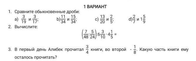 1. Сравните обыкновенные дроби: 3 3 11 15 19 2. Вычислите: a) итт И 34 34' 1 ВАРИАНТ 13 2 И 20 5' 7.5 :6- 48 24 10 4 = d) и 15 3. В первый день Алибек прочитал 3 книги, во второй -3. Какую часть книги ему 4 8 осталось прочитать?