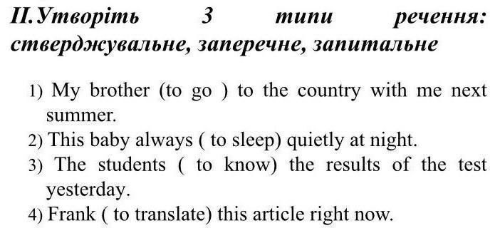 Ответ:1.My brother will go to the country with me next summer.My brother won’t go to the country with me next summer.Will my brother go to the country with me next summer?
