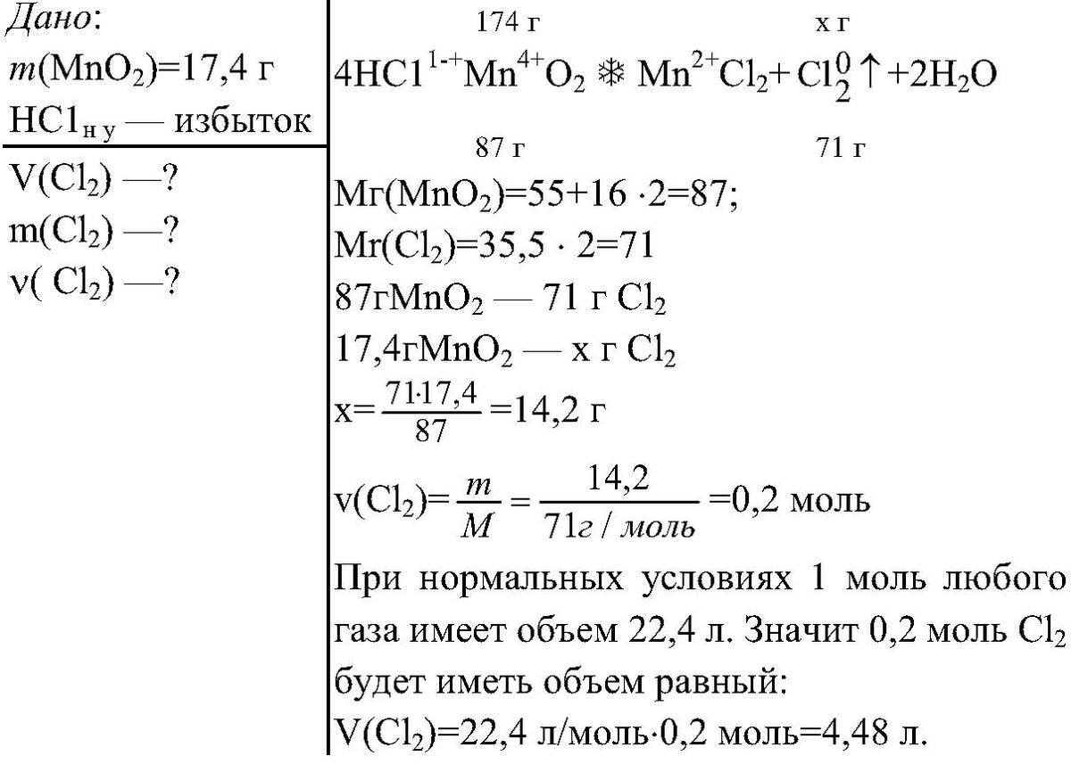 Какой объем, масса и количество вещества хлора при нормальных условиях выделится при взаимодействии оксида марганца(IV) MnO2 массой 17, 4 г с соляной кислотой, взятой в избытке?