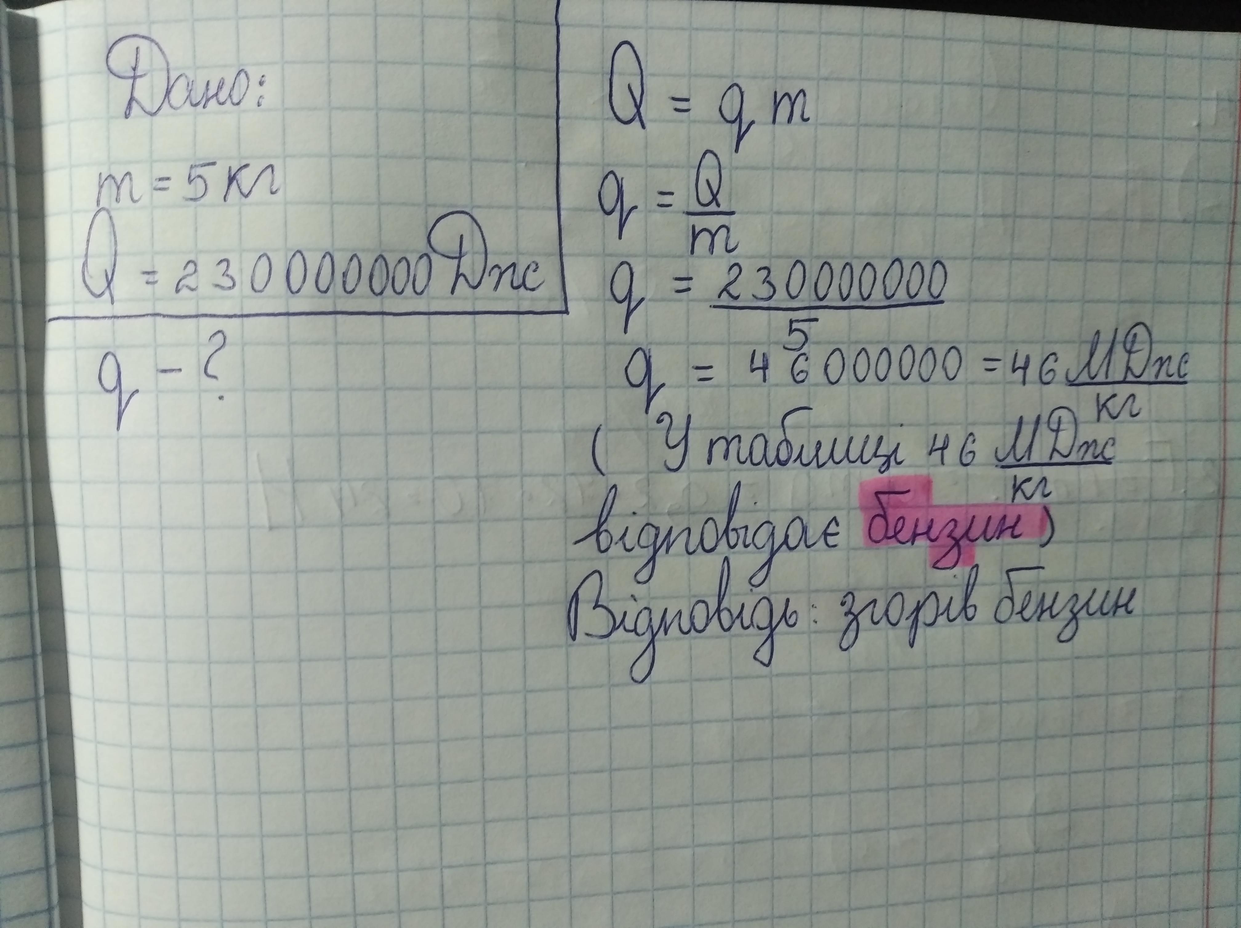 При згорянні 5 кг якогось виду палива виділилося 230 МДж енергії. Яке паливо згоріло? У відповіді написати назву палива