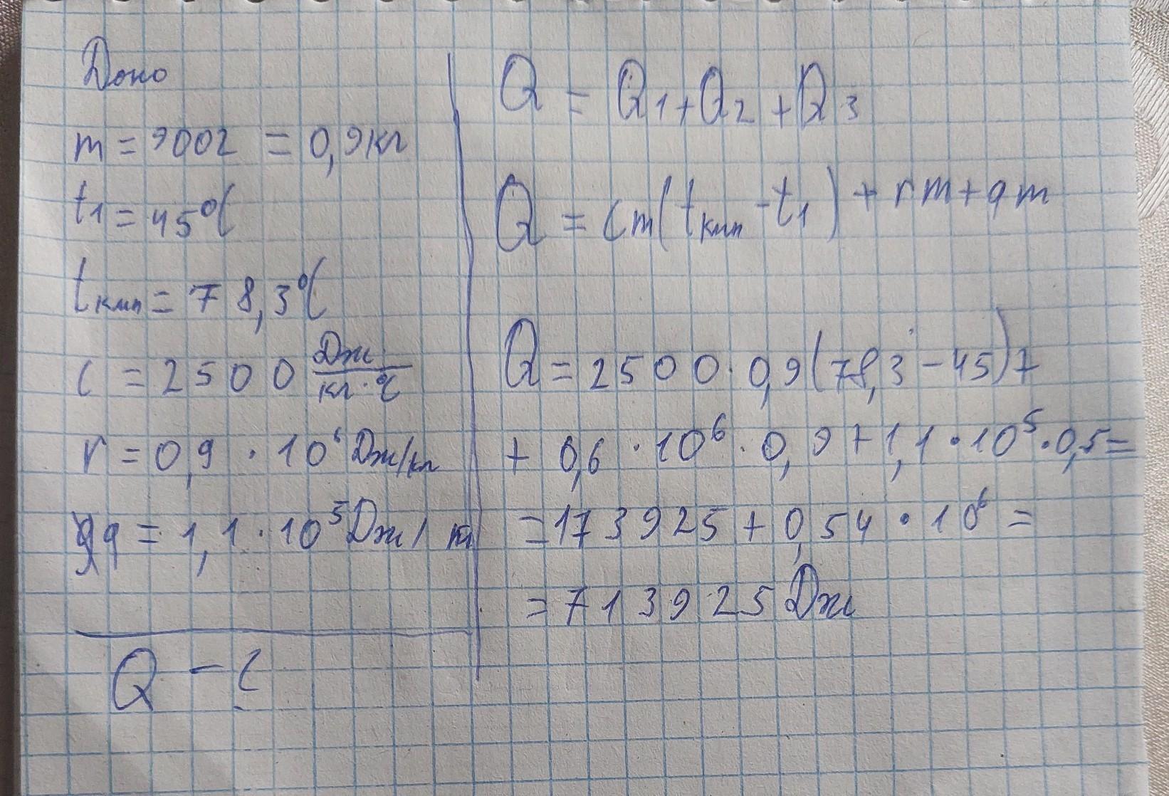 Спирт масою 900 г, що має температуру 45 °С, нагріли до температури кипіння