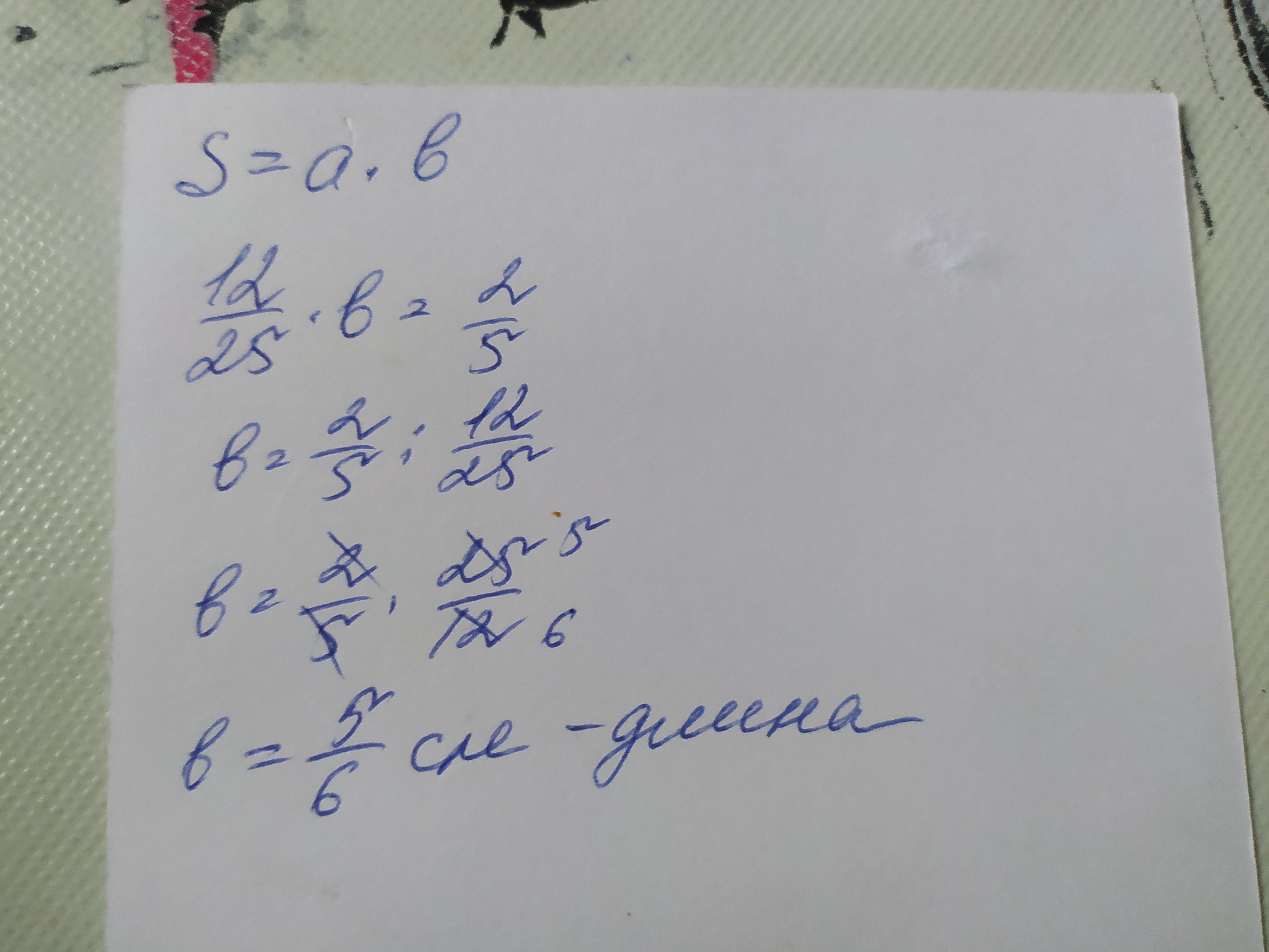 площадь прямоугольника равна 2/5 см². вычислить длину прямоугольника если его ширина 12/25 см. помогите разобраться с задачей.