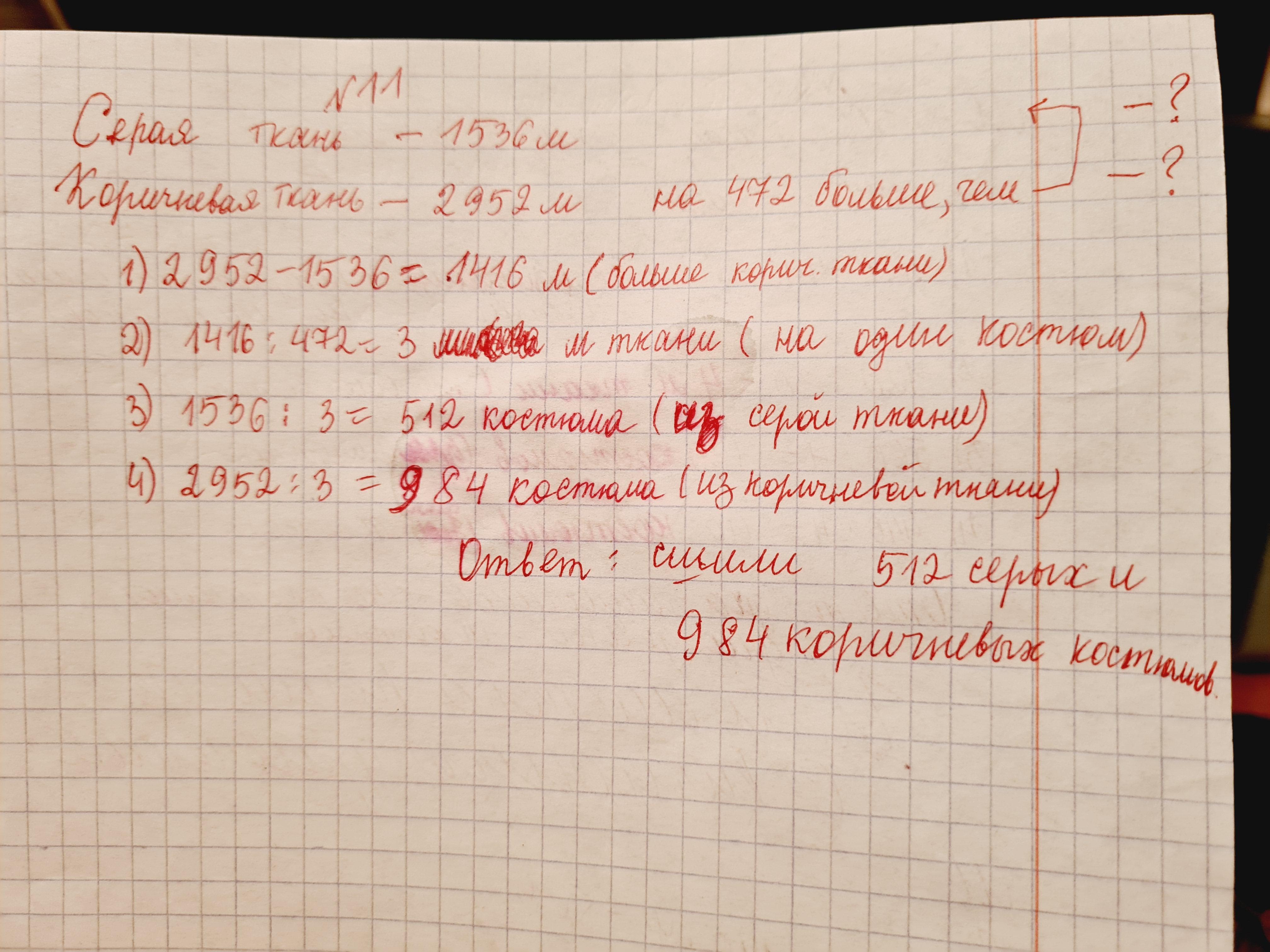 ДОМАШНЕЕ ЗАДАНИЕ (11) Реши задачу. На швейной фабрике сшили костюмы из 1 536 м серой ткани и 2 952 м ко- ричневой ткани. Коричневых костю- мов вышло на 472 больше, чем серых. Сколько сшили серых и коричневых костюмов? СДЕЛАЙТЕ ПОЖАЛУЙСТА ФОТОМ ТАБЛИЦОЙ ИЛИ ОТРЕЗКАМИ!!