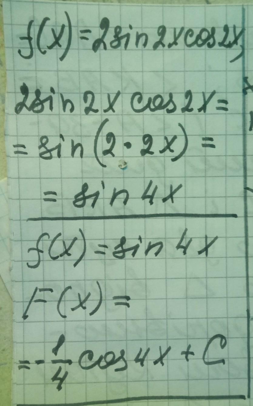 Знайдіть загальний вигляд первісної для функції, передньо спростивши її: 1) f(x) = 2sin2xcos2x;