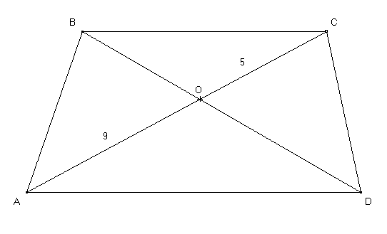 Точка пересечения диагоналей трапеции делит одну из них на отрезки длиной 5 см и 9 см. Найдите основания трапеции, если их сумма равна 70 см.