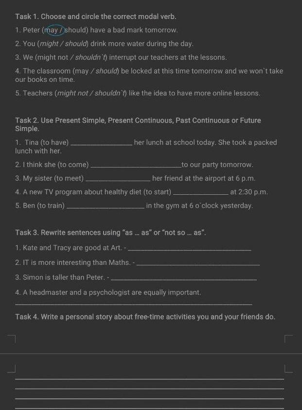 1. may, 2. might, 3. should. 4. should. 5. might not