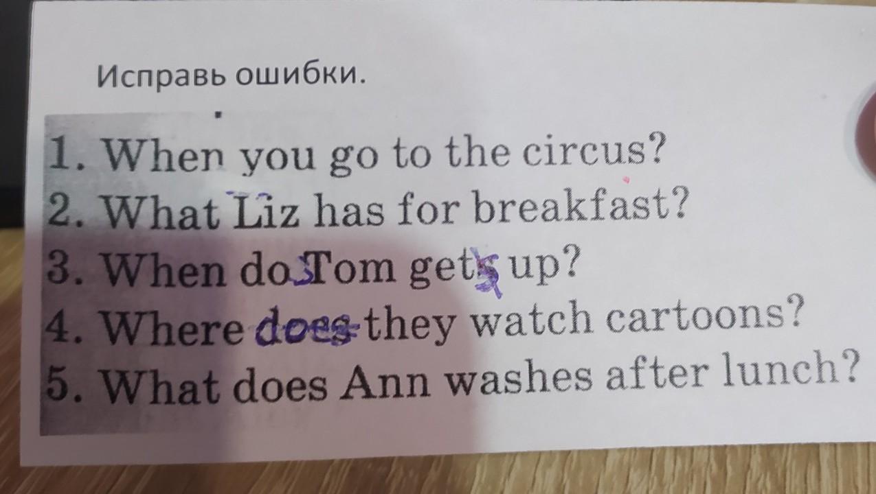 Исправь ошибки. 1. When you go to the circus? 2. What Liz has for breakfast? 3. When do Tom gets up? 4. Where does they watch cartoons? 5. What does Ann washes after lunch?